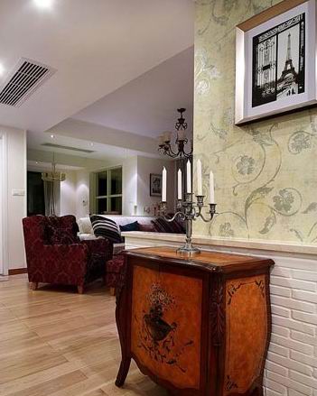 玄关一角的装饰墙,同样采用了素色印花壁纸,搭配仿砖纹的白色墙面,造型清新,耐人寻味。仿古手绘玄关柜与之搭配,更加凸显了怀旧的风情。