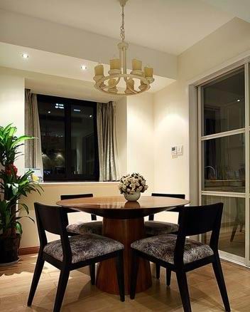 餐厅造型独特的圆形木质餐桌,与四张舒适的餐椅组成了温馨的四人用餐区,非常适合小家庭的用餐布局,搭配创意吊灯,显得温馨又别致。