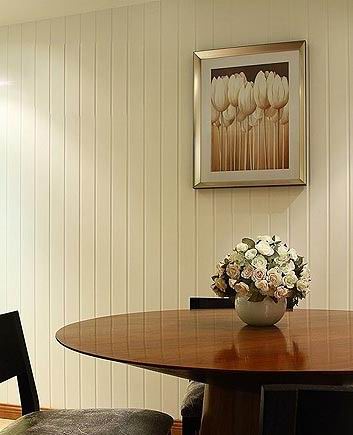 餐厅的背景墙只采用了简洁的白色板材,搭配温馨的装饰画,营造出淡雅宜人的感觉,让用餐环境更加舒适自在。