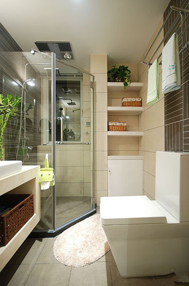 洗手间的洗脸盆放了盆富贵竹,富贵竹很好养,适当加些水就可以了。