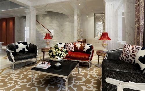 亮点:舒适脚感的地毯是欧式装修地面的主要角色,暗红色、西化的造型的沙发是典型欧式田园家具,皮毛质靠垫和新红色台灯,浓烈华美的新古典软装。