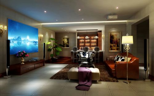亮点:视听室皮质家具富丽奢华,壁灯、落地灯淡黄幽暗光营造了舒适轻松的古典环境。抓住了现代欧式色彩柔和艳丽的要点。