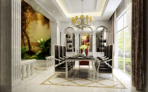 亮点:古典式餐桌椅和落地长帘,挑高气质带来清新欧式古典风格。线条柔和的水晶灯和高贵丝质面料布艺是成功的搭配。