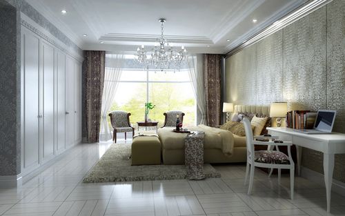 亮点:雅黄和银白的色调非常优雅,从壁纸到地毯都用细碎纹理统一了装饰感,让卧室唯美而不凌乱。小阳台的茶几沙发让主人享受暖暖午后时光。