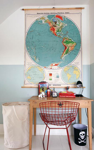 男孩房,白色和蓝色将墙面分成两个部分,简单之中彰显个性。