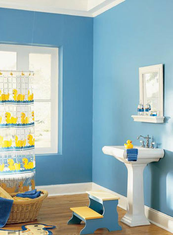儿童浴室,色彩应该生动而丰富,蓝色背景下,白色与黄色的点缀显得色彩分明。