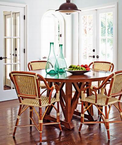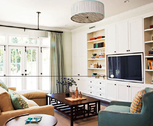 法式门上面的横挡和可旋转的侧窗为这个家带来了阳光和新鲜空气。内置的细木家具使这些储藏柜呈流线型,并提供了一个壁龛放置这台平面电视。