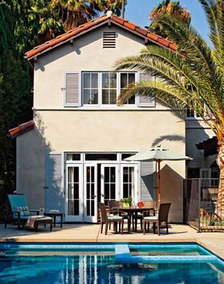 起居室外的后院加设了一个小型游泳池,阳光明媚的大棕榈树下,一派悠闲舒适的居家场景。