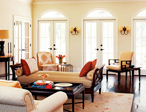 原来的一扇单窗使得室内的采光不佳,设计师大胆地将窗户拆除,均等分布地开设了三扇法式双开门,拱形门头造型优雅大气,与户外也更亲近,室内场景与室外的景观都那么令人愉悦。