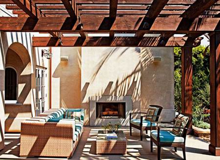花旗松凉亭界定了室外的休闲区域,它通过连廊与房子连接。壁炉使得室外如同室内一般的舒适。沙发围合出了惬意的休闲区。