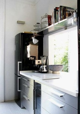 利用厨房里的另一端墙面,直线布置出厨柜,开放式的置物架实现了展示性收纳整理,使用快捷的同时并让立面更加精彩。