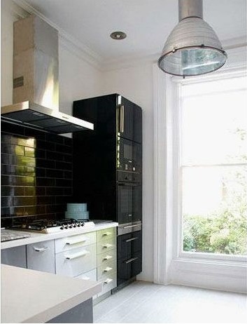 利用墙面的凹角处打造出储物空间,用来放置大型的厨房电器和壁柜,大大节省了空间,同时也保持了空间的整体性和利落感。厨柜整体采用了现代感的简洁造型,规整大气,能够与整体明畅的空间环境相协调。