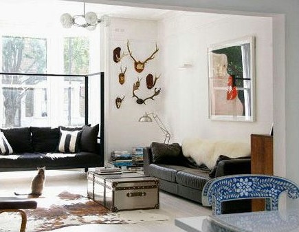 房间基调色是经典的黑色与白色的组合,沙发区中间的地毯给人自然和温暖的感觉,墙上的动物装饰也带来久违的亲切感。在一派平和的气氛中,“红唇”装饰画的出现为黑白色调的房间增添了俏皮活力。