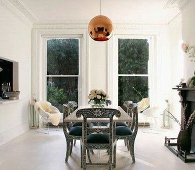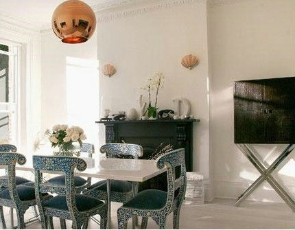 将传统的印度图案搬上餐椅,以此来作为整个就餐区的视觉中心点。金色吊灯悬于高空,金属感的肌理与光洁的家具形成呼应,汇成立体的混搭交响。
