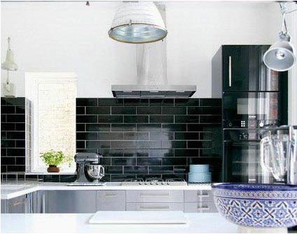 料理台面上黑色的瓷砖与其他房间的风格相同,白色的粘缝剂仿佛整齐排列的几何图形,比起单纯的用色,这样的搭配更能提升厨房里的视觉效果。