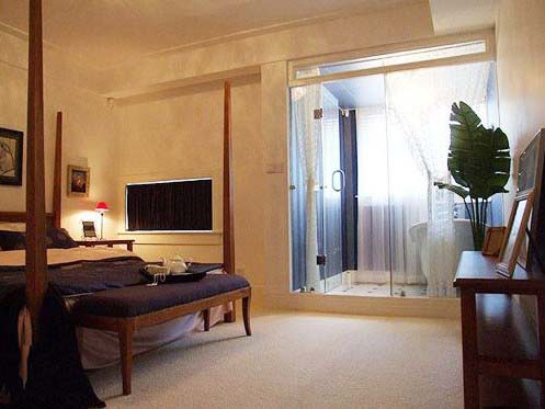 虽然主卧主要采用沉稳的布置,但同时又兼顾到女主人的性格特征,设计了开发式的浴室,并用白色纱帘装饰,浪漫唯美。