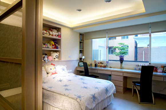 维系和室的明亮光源,女儿房使用夹纱拉门,窗台边长型书桌设计让两个女儿可以结伴一起共读,床头做成表示层板,小女孩心爱的玩偶是最棒最可爱的空间装饰。