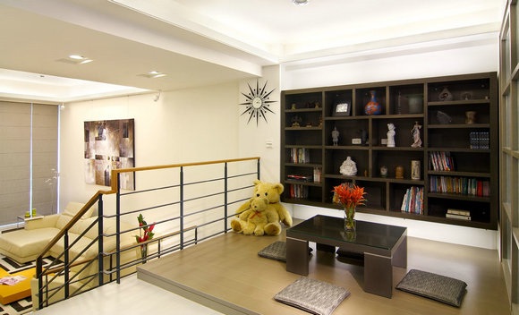 黑色铁件与木质组合而成的梯体,轻巧又富有柔润的温度,串联每一楼层的风景。往上走是开放式的和室,利用女儿房的夹纱拉门,引入明亮采光,门框木作为特别调制的色彩,与米灰色木地板、曼特宁沉稳书柜,表现出协和的调性氛围。
