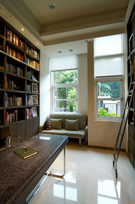 挑高4米2的书房则以整面书墙,加上活动梯子的设计,彰显人文书香的情调。透过周靖雅设计总监精湛的美感叙述与美学定位,每一个用色、元素、语汇皆浑然天成,成就这处细致雅适、清隽内敛的现代居宅。