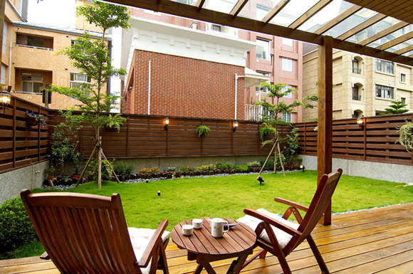 设计师强调里外关系的呼应与融合,宽阔的后院以木板为架构,加上壁灯照明、绿意草皮、小树植栽,畅快写意,令人忘却凡尘琐事。