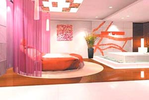 卧室是集中体现喜庆、温馨、浪漫气息的地方,可选用大红色、粉色、藕荷色、桃红色、浅黄色等。灯光应柔和,以中色暖色调为主。