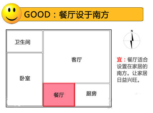 餐厅宜设在南方,因为南方日照光线充足,给人温暖,容易营造出幸福美好的环境;而且南面属火,可令家道如火势燎原,日益兴旺。