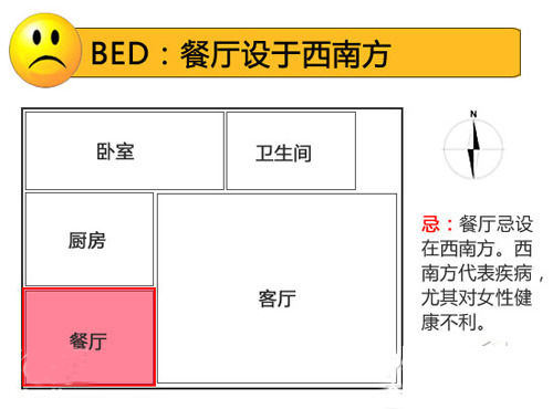 餐厅忌设在西南方,从风水角度分析,西南方为飞星两黑管事,代表疾病。如果餐厅设置于房屋的西南方,则不利于家人的身体健康,尤其对女性不利。因此,考虑饭厅位置的时候,必须多加留意。位置宜忌:宜靠厨房勿靠卫生间。