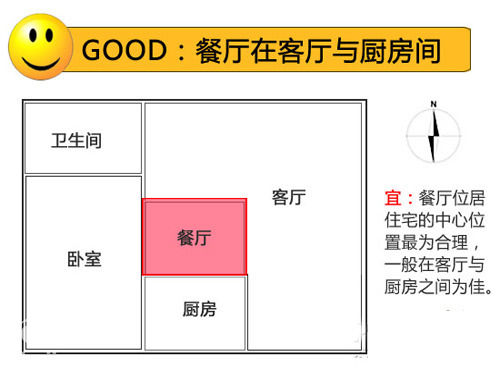 餐厅应位于客厅和厨房之间,位居住宅的中心位置。这样的布局可增进亲子间关系的合谐。一般来说,餐厅靠近厨房是最理想的,对于家人的健康十分有利,而且能够避免厨房的油烟进入客厅,阻挡好运气的进入。