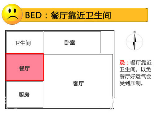 餐厅切忌位于上一层楼的厕所的正下方,因为餐厅的好运会受到压制,也须避免利用邻近厕所的空间当餐厅。如果难以避免,餐桌应尽量远离厕所,并采用一些装饰手段进行遮挡。此外,餐厅也切忌靠近玄关鞋柜,以免鞋柜的难闻气味影响食欲,影响健康。