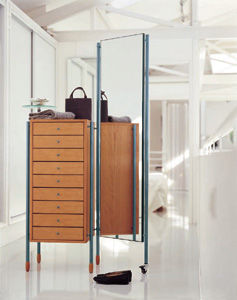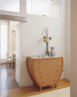 柜子:玄关面积不大,许多人会在这里摆放一个方正的大柜子,如果在柜子的造型上稍作改变,如将方正的柜子改成斜三角形、倒梯形……存储的东西不少,却显得更轻巧。