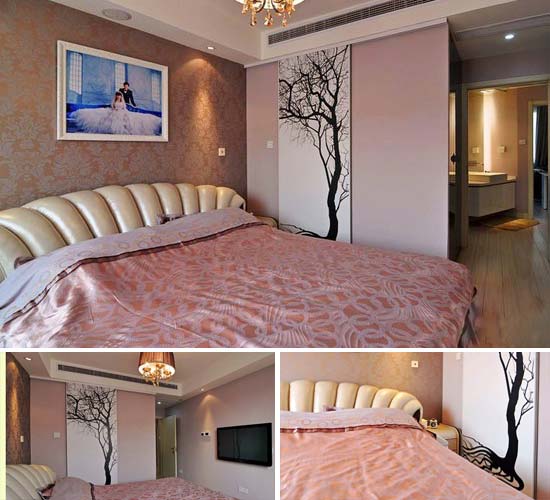 主卧色彩采取浅紫+粉红,妩媚舒适是最大的特色。白色艺术感强的挂画及大型的衣柜让追求美丽的女主人心醉不已。