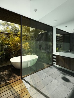编辑点评:洁白如鸽蛋般的浴缸屹然置于露天空间之中,用透明的玻璃窗做隔间。纯天然的沐浴享受,低调而奢华!