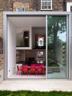编辑点评:从屋外看餐厅,透明的玻璃拉门不仅很好地增加了采光,而且也给整体的通透色彩设计增加了光亮。一眼望去,红色正是夺目。