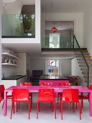编辑点评:素白的空间里红色的餐桌是颜色的汇聚点,粉红色与大红色的烤漆亮面十分可爱活泼,多了些俏皮的味道。
