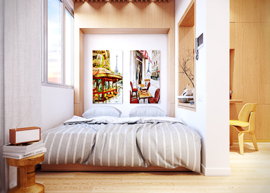 编辑点评:双层陈列架装饰墙壁,提高空间收纳功能,一长一短,参差不齐的设计又巧妙提高空间的艺术感和层次感,给这简约的空间带来些许灵动。方块的原木背景与地板和衣柜相互呼应,展现空间特有的自然亲和力。