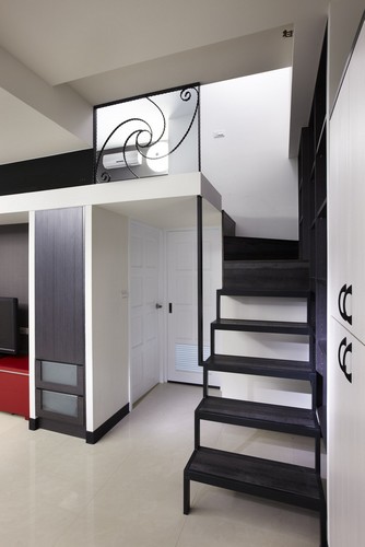通往二楼的楼梯雕花扶手除去了工作室的冰冷,让整体在都会风格中带点柔和典雅的元素,也象征进入了比较隐密的私人空间。