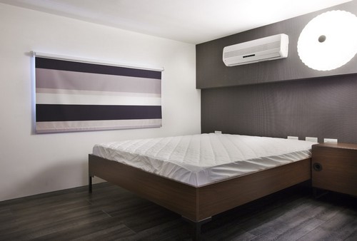 主卧床头一整面深色木贴,与深色地板连成一气,加强整体设计感,再辅以现代灯具,都会气息便隐约其中。