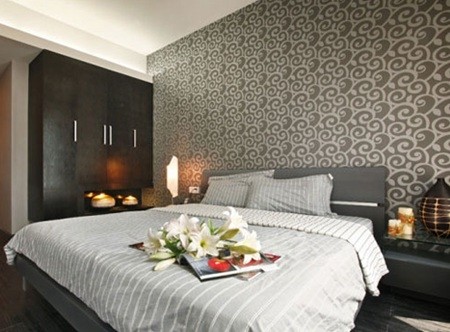 沉静的卧室氛围来自于深色调,以及条纹的床品设置。床头仿佛祥云图案的壁纸,选用了卧室里的灰白两色,跟黑色适当调和,层次分明。