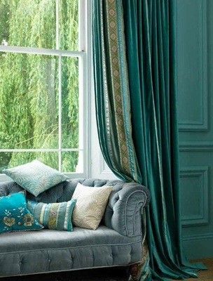 这图的优点在于窗帘和沙发之间的一唱一和,色彩主题变得非常明确。同时,窗帘和沙发的色调是很好的底色,可以为其他颜色提供极具包容性的优雅背景,纯度降低的蓝色靠垫毫无疑问的将季节带入冰凉的秋。