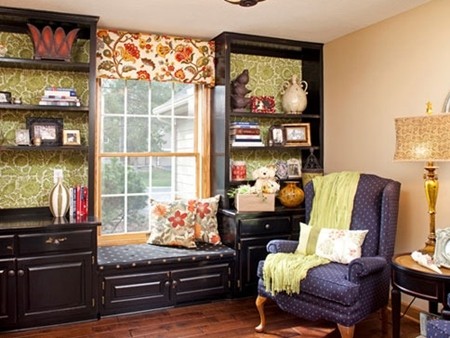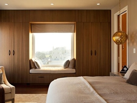这间卧室的窗台位于墙边,以最简单的方式为其改造,将窗台筑高,铺上坐垫,放上靠包即可,这样能照射到阳光的小角落,是最不能错过的。窗外是美妙的景致,窗内是有情有调的私人空间。