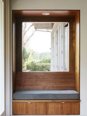 十分干净的整体窗体,这类飘窗多见于转角空间,将凹陷的区域,用木头打造,不仅墙面贴上了木板,窗框、座椅、收纳柜都为一体式的木头,最后放上灰色的坐垫,成就一款简约大气的休息区。