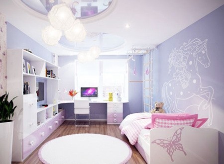紫色甜美小女生房,整个布置整洁大方。墙上的贴画充满了想象的感觉。整体书柜同时也充当着电视柜和展示柜的角色,很哈的陈列着各种小巧可爱的装饰物。