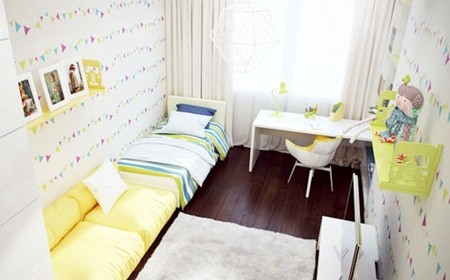 狭长的儿童房,小床和沙发都靠墙摆放,嫩黄色的整体色调充满活力。柜子、沙发、床一字型排列在墙边,很好的节省了空间。墙壁贴满花色壁纸,墙上还有简易的搁架。床的另一侧对应的就是小小的电视柜以及嵌在墙中的搁架式书柜。