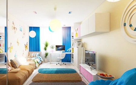 蓝色调空间,同样为狭长户型,长长的色块拼接地毯从门口延伸到内部。一侧是书柜和电视柜以及带收纳柜,很有序的排列着。满墙的蝴蝶很美,和房间的色彩搭配的也很协调。