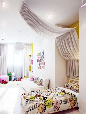 整个墙面充满设计感,在书柜和床的位置呈内嵌样式,很好的将中间的沙发背景墙部分突显出来。靠窗的部分还留出了小块地方当成休息玩耍区。