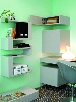 绿色墙面上,白色的搁板上可以摆放很多东西,作为环保色的绿色让书房空间充满绿意。