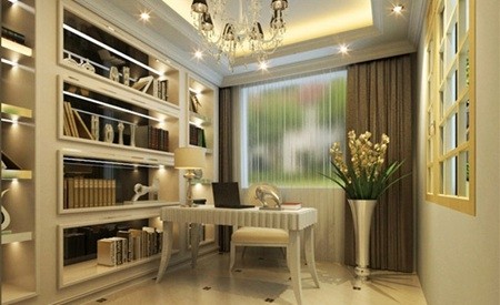 白色瓷砖地面,大气的墙面式书架,不规则隔断设计元素在里面,整个书房空间时尚中带有一点点的小奢华。