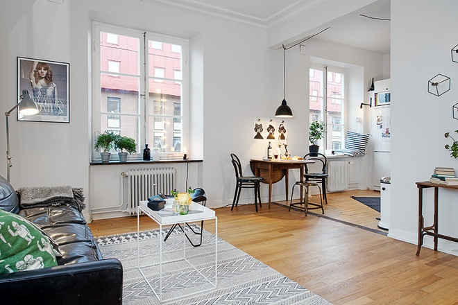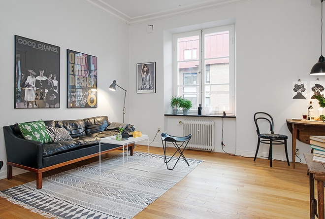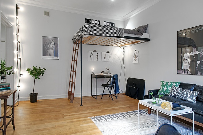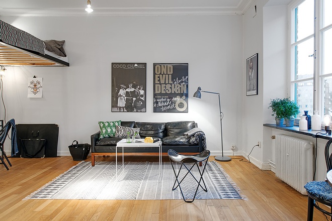 这座仅有38平米的小公寓,高达3米的宽敞天花板为客厅提供了很好的呼吸空间,阳光可以在整间屋子里肆意游荡。开放式的厨房,宽敞的两个大窗户,隐藏在客厅后的美丽白色浴室,黑钢的床架、两套沙发、书桌、床还有衣柜……