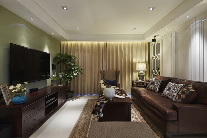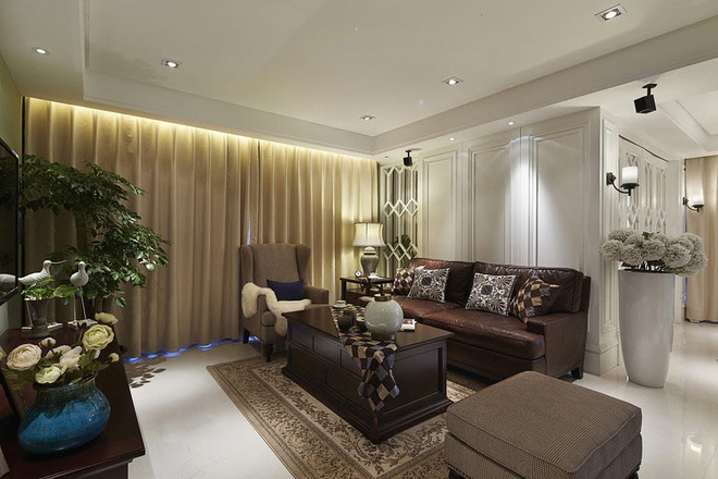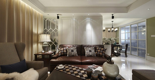 本案列设计师因为业主的年纪在中年阶段喜欢的东西更多的是沉稳以及质感,所以选择了保守的中性色,为了整体色调不过于沉闷,沙发背景处设计的蜂窝造型,结合镜面材质,使的整个空间变得明亮轻快。