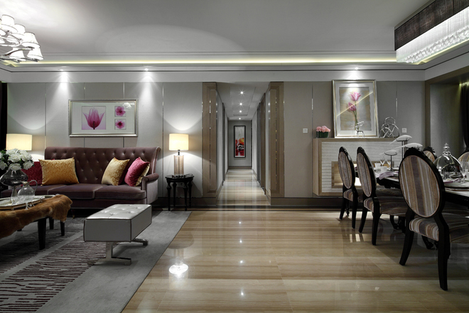 宁波装修网推荐经典案例——江南一品165平米新古典样板房:本案构思简捷、线条流畅、色调明快,呈现现代简约格调,以此为基础,设计师加入了适量的古典元素,形成了一种新的古典风格。从木质地板、墙纸、家具到地毯,几乎所有的材料上都出现了条纹图案,条纹的线条独特,是永不过时的经典元素,灵活运用即便于统一主题又可营造古朴大气的氛围。在色调的选用上,本案以材料的原始色彩为主,原木色无需刻意改造,更贴近自然,以亮色稍加点缀,显得厚重而素雅,完美的诠释了新古典的意义内涵。